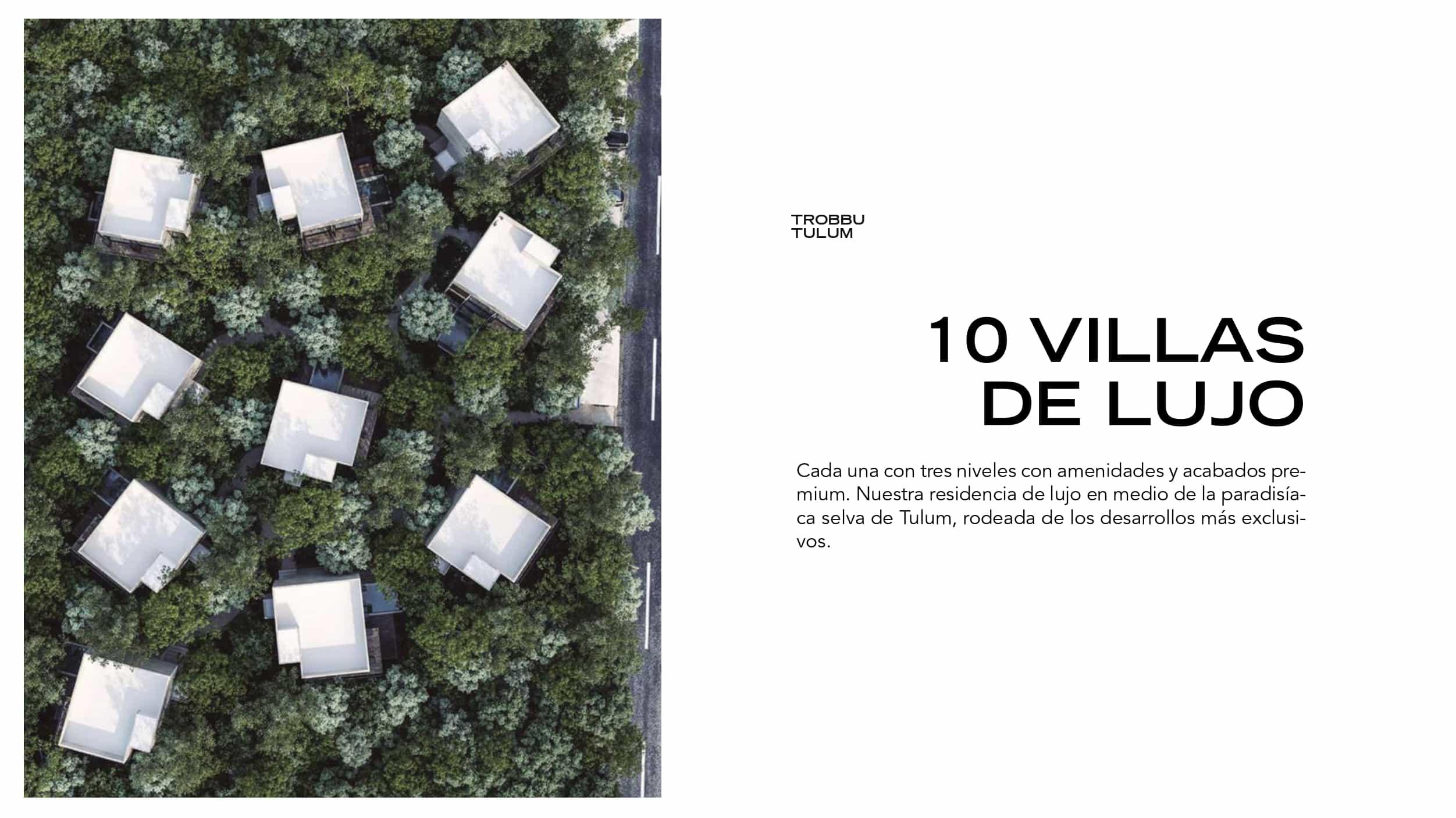 En el corazón de la paradisíaca selva de Tulum, a solo 7 minutos de la playa por Av. Kukulkán y rodeadas de hoteles boutique y desarrollos exclusivos, se ubican las 10 villas de lujo Trobbu Tulum. Cada residencia, distribuida en tres niveles y totalmente amueblada, ofrece acabados premium, terrazas privadas y amenidades únicas como acceso a beach club, chef privado con mención Michelin, mayordomo, spa, áreas de relajación y bicicletas incluidas.
